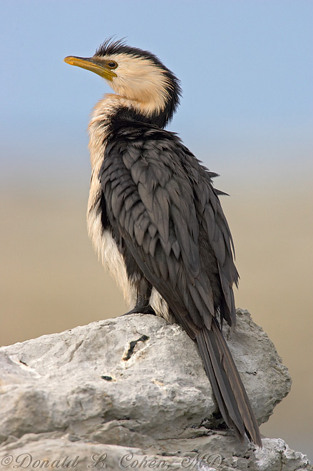 We had spotted a number of these cormorant-looking birds, before knowing what they were, and I was really hoping to get some photos of them, as well as find out what they were. While shooting the Oystercatchers and White-faced Herons, I spotted an individual off on the rocks, and gradually made my way toward him, shooting periodically as I got closer. There was a small channel of water separating his rock from where I was, so fortunately I guess he didn't feel too threatened, and I was able to get fairly close to him. To get the shot above, I lowered the tripod a foot or so, so I could shoot at a slightly upward angle, to put the blue sky behind his head. This is one of my favorite shots from this trip.