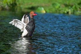 I was fortunate to have this particular duck rise up and start flapping his wings while the sunlight lit up its face.