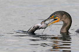 Alex had been watching this Cormorant fishing for quite a while, and as we were standing around, he finally came up with a fairly large catfish. We all quickly repositioned ourselves, and got a few frames of the action. (The flash setting was certainly an error, for those paying attention to that information.)